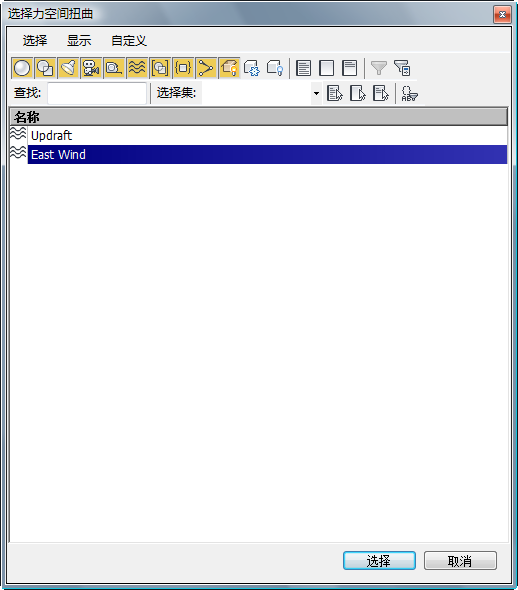 - 单击然后在按住 Ctrl 键的同时单击以高亮显示“East Wind”和“Updraft”空间扭曲,然后单击“选择”。