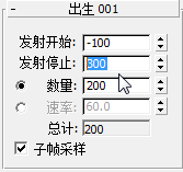 从设想的第 –100 帧开始发射意味着在动画开始之前就通知 3ds Max 生成粒子,这样,在第 0 帧中,此场景中已存在一些烟雾。在第 300 帧(即动画的最后一个帧)停止粒子发射意味着将在整个动画中持续显示烟雾。