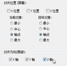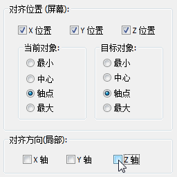 “对齐位置”组中,启用“X 位置”、“Y 位置”和“Z 位置”。 确保已在“当前对象”和“目标对象”组中选中“轴点”。