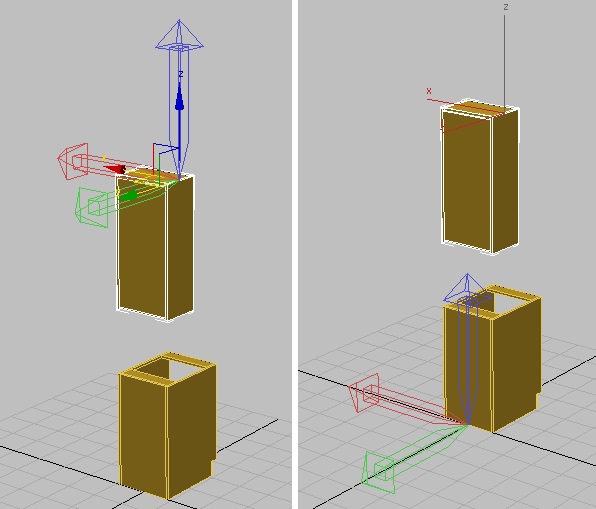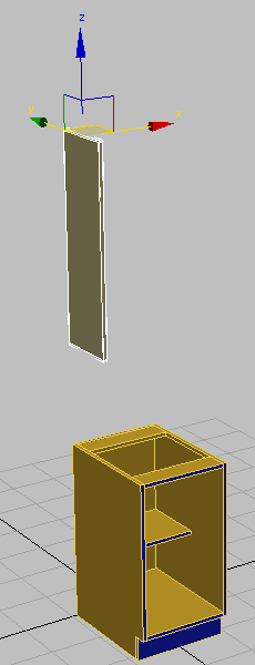 最后,修改上橱柜,以便其局部坐标(由其轴点表示)与下橱柜中的局部坐标相同。按照此方式,下次要在场景中放置上橱柜时,会将其定位于相对地面的正确高度,并与下橱柜成一条直线。