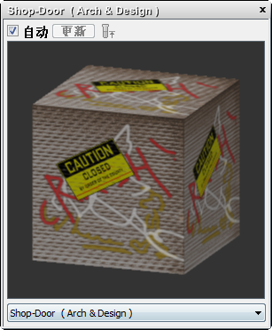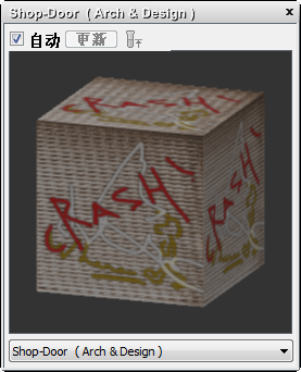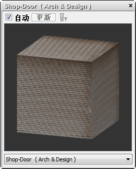 第一个示例窗中包含名为 Shop-Door 的 Arch & Design 材质。已将此材质应用于汇总快门对象 (door-sec)。