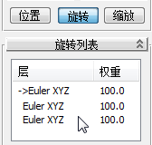 “PRS 参数”卷展栏中,确保“旋转”按钮处于活动状态,然后在“旋转列表”卷展栏上,验证是否已将新的子控制器(总共应该有三个)添加到旋转列表中。