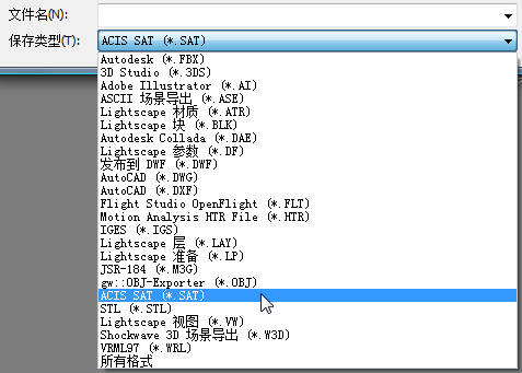 - 在“选择要导出的文件”对话框中,从“另存为类型”下拉列表中选择“ACIS SAT (*.SAT)”。