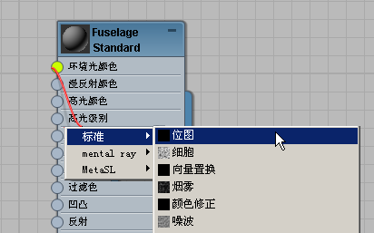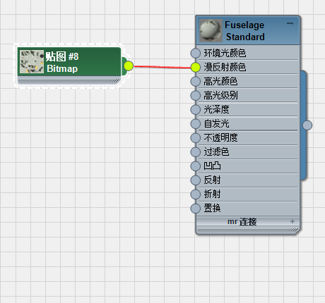 - 在活动视图中,从“Fuselage”材质节点的“漫反射颜色”输入孔拖动一个关联,然后释放鼠标。从弹出菜单中选择“标准”