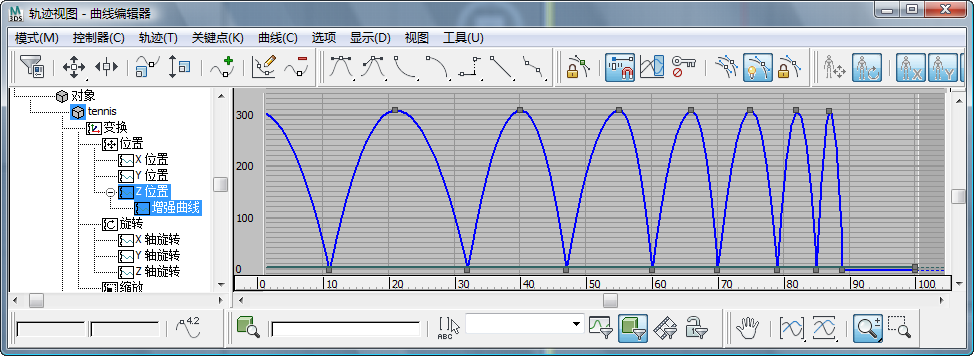 “应用增强曲线”。 3ds Max 会将增强曲线添加到“Z 位置”轨迹。它还会更改曲线窗口显示,以便所有曲线均显示。