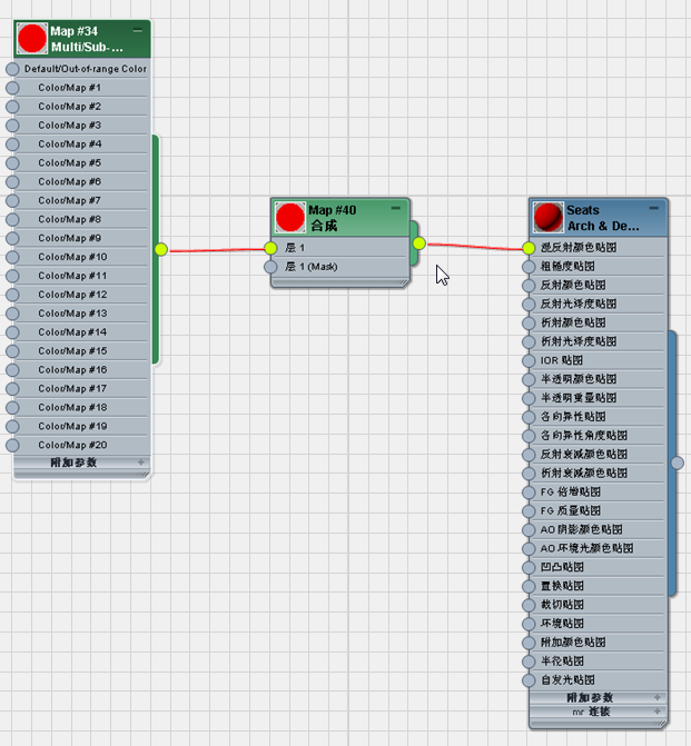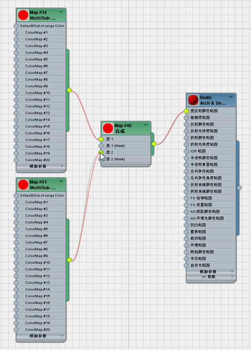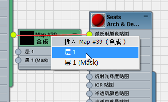 “合成”)。在活动视图中,将贴图放到连接多维/子贴图和 seats 材质的关联上。 3ds Max 会显示一个光标,该光标指示您正在将贴图插入到关联中。当此光标显示时释放鼠标。