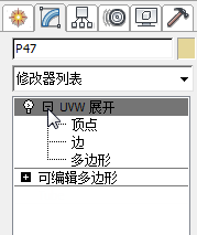 - 打开“编辑 UVW”对话框工具栏右侧的下拉列表,然后选择“贴图 #8”(p47_tex.jpg)”项(贴图编号可能有所不同)。
