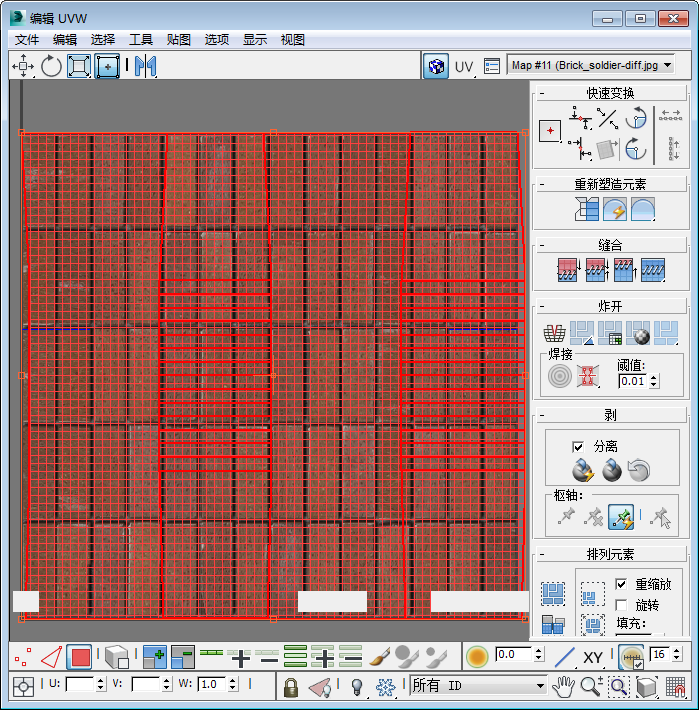垂直调整后的 UVW 栅格大小正好覆盖四行砖,每面一行砖
