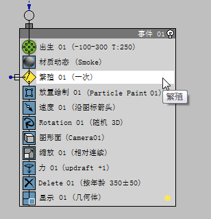 增大烟雾粒子数目的一种方法是:只需增大“Birth”操作符中的“数量”值。但是,在本课中,我们将通过使用“Spawn”测试来调整粒子数目。这种备用方法非常有用,并且使用“Spawn”还会在下一节课中创建余烬时助您一臂之力。