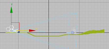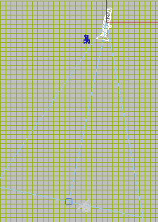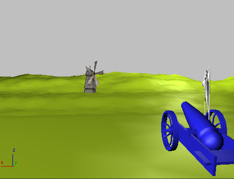 - 在“顶”视口中,单击大炮后面略偏靠右的位置,然后下拖至刚好位于风车左侧的点(如下图所示)。不要担心摄影机仍未放置在准确的位置:后面将对此进行调整。