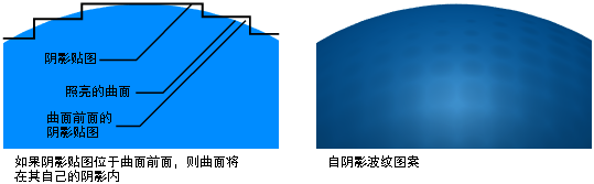 被照亮的阴影投射曲面上可能会出现以下问题:由于该阴影贴图具有固定的分辨率,它可能不够平滑而无法用于呈现曲面。该阴影贴图实际上可能会与曲面相交。这意味着被照亮的曲面将部分处于它自己的阴影内。结果在曲面上出现了一个暗波纹图案。