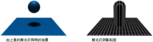 聚光灯使用阴影贴图(或深度贴图)来计算曲面所投射的阴影。如果曲面是由聚光灯照亮的,则阴影贴图将始于被照亮的曲面并从该灯光延伸出去。位于此阴影贴图内的任何曲面都将处于阴影中。