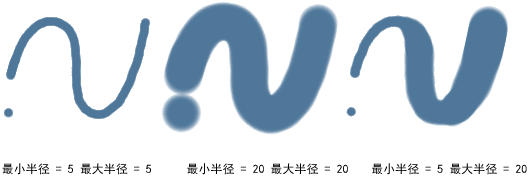 画笔的大小基于它的“Min Radius”(当您轻轻按手写笔时)和“Max Radius”(当您用力按手写笔时)。如果不希望画笔的大小随着绘图板上手写笔压力的变化而变化,请将“Min Radius”和“Max Radius”设置为相同的值。