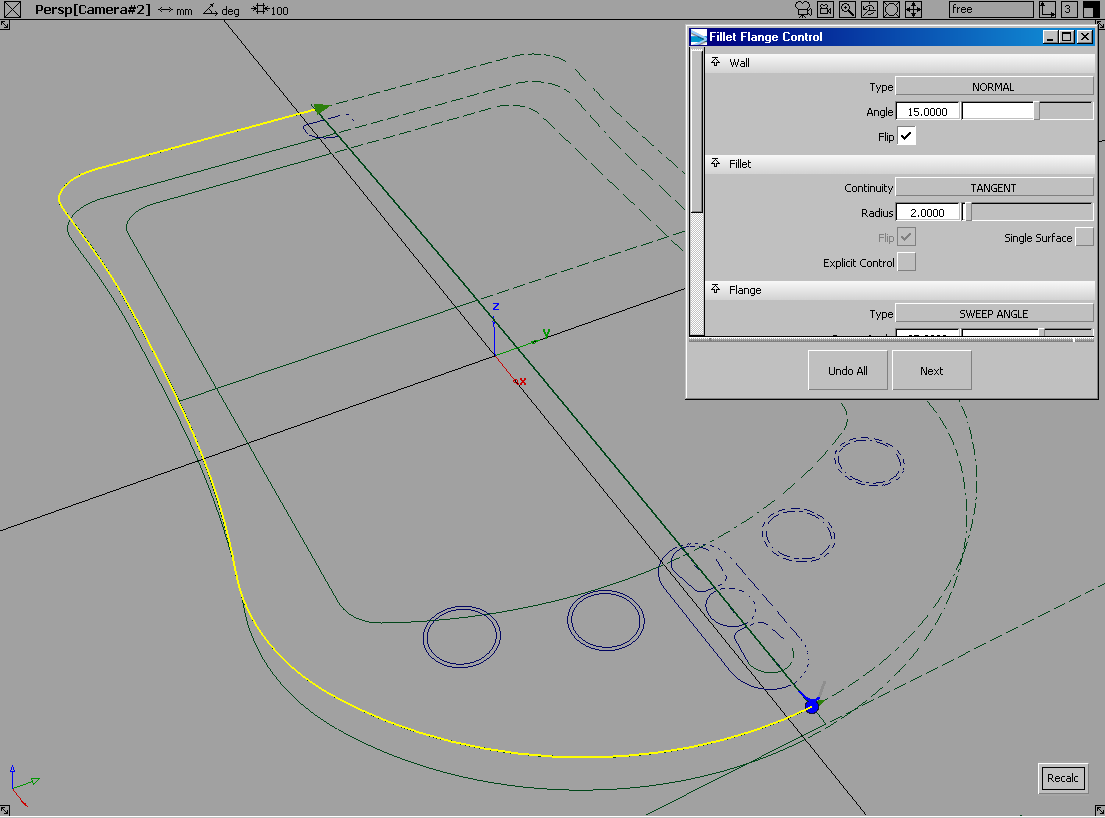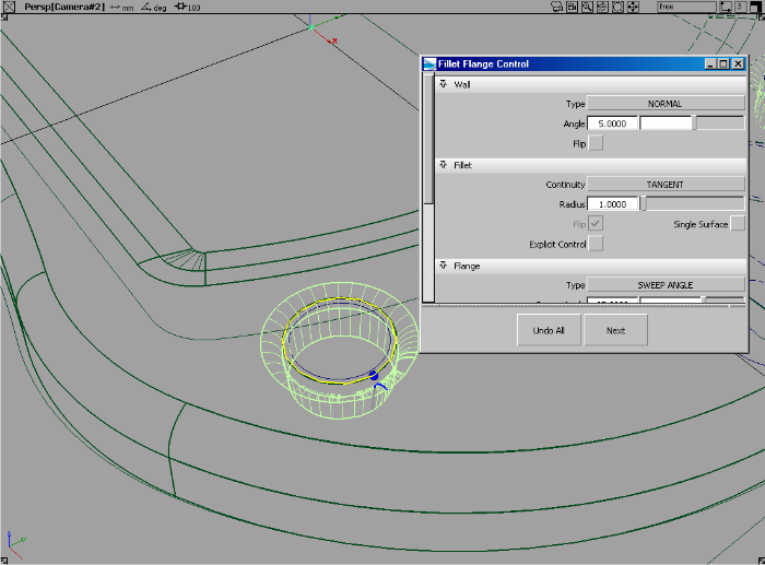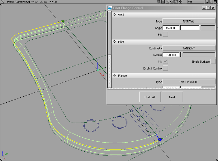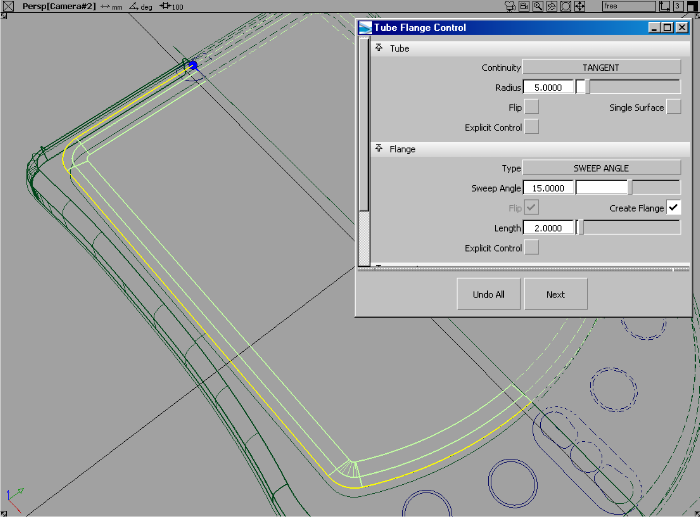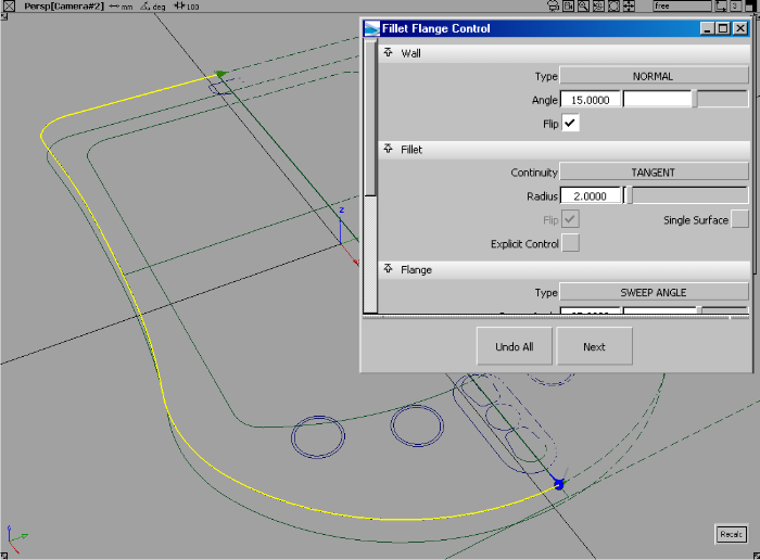 - 在控制窗口中,将“Fillet size”调整为 5,“Flange sweep angle”调整为 15,“Flange length”调整为 2。