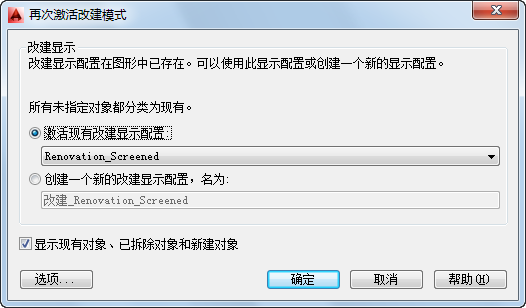 在先前激活的图形中重新激活改建模式后,可以继续使用现有的改建显示配置或创建新的显示配置。
