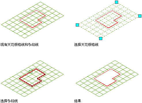执行以下步骤可以在现有的天花板格线中创建孔。孔是基于格线边界内部的闭合多段线或 AEC 对象创建的。孔内部的所有格线部分将不会显示。
