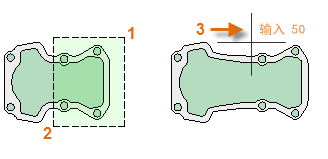 使用 STRETCH 命令(或在命令窗口中输入 S)并使用窗交选择选择对象,如下图所示(1 和 2)。窗叉选择是必需的 - 将仅拉伸因窗交选择而相交的几何图形。然后,单击绘图区域中的任意位置 (3),将光标移动到右侧,并输入 50 作为距离。此距离可能表示毫米或英尺。