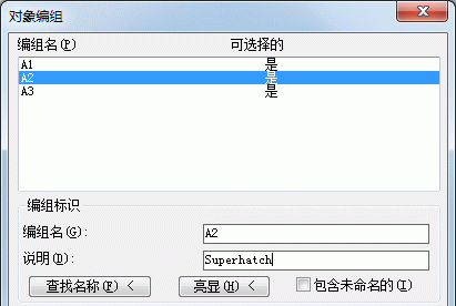 3) 选择编组。请注意,“Superhatch”将显示在由 SUPERHATCH 创建的编组的说明字段中。