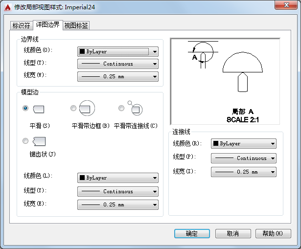 设置局部视图的详图边界线、模型边和连接线的特性。