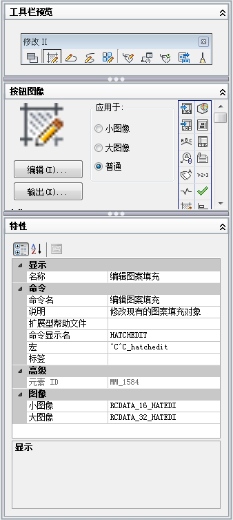在开始自定义功能区选项卡和面板、快速访问工具栏和其他用户界面元素之前,您应当熟悉自定义用户界面 (CUI) 编辑器(可以使用 CUI 命令打开它)。“自定义”选项卡在默认情况下显示并分为三个窗格:“...中的自定义设置”、“命令列表”和“动态显示”窗格。