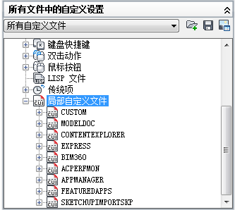 在此窗格中,可以创建和修改用户界面元素(例如功能区选项卡和面板)以及快速访问工具栏。沿着窗格的顶部可以找到一些工具,这些工具可以用于将部分自定义文件加载到主自定义文件、将更改保存到已加载的自定义文件以及控制如何查看已加载的自定义文件。