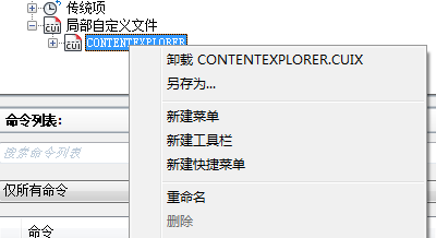 如果试图加载的局部 CUIx 文件与主 CUIx 文件具有同名的自定义组,必须在加载之前更改自定义组名。在 CUI 编辑器中打开局部 CUIx 文件,选择自定义组名,然后单击鼠标右键以进行重命名。