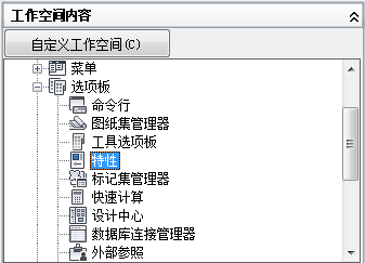 在“工作空间内容”窗格中,单击“选项板”旁边的加号 (+) 以将其展开。