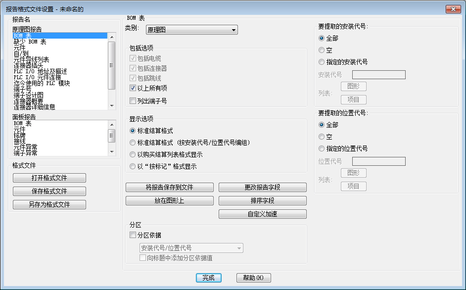使用此对话框可以预设报告选项、字段设置、报告表格设置,输出文件设置等。报告选项可能不同,具体取决于您选择的报告类型。