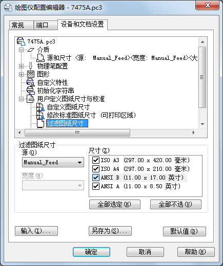 修改绘图仪配置的特定设备特性。每一种绘图仪的设置各不相同。如果绘图仪制造商没有为设备驱动程序提供“自定义特性”对话框,则“自定义特性”选项不可用。