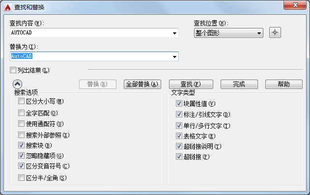 指定是搜索整个图形、当前布局还是搜索当前选定的对象。如果已选择一个对象,则默认值为“所选对象”。如果未选择对象,则默认值为“整个图形”。可以用“选择对象”按钮临时关闭该对话框,并创建或修改选择集。