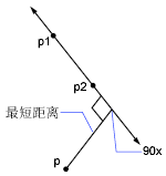 确定点 p 到直线(通过点 p1 和 p2)的最短距离。