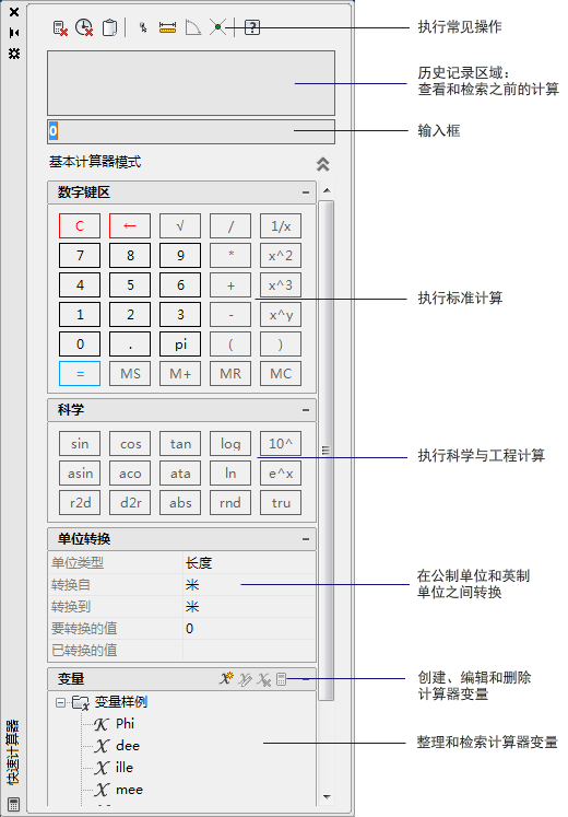 除了在科学计算器中的基本功能以外,“快速计算器” 计算器还包括几何函数、单位转换和变量。