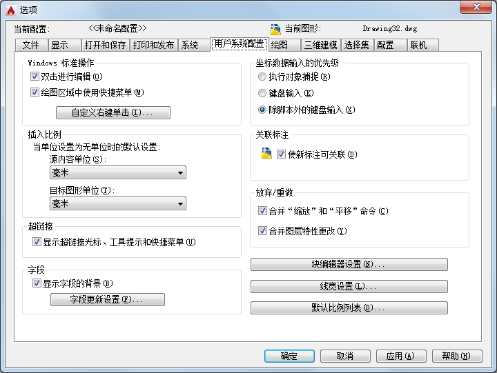 显示“自定义右键单击”对话框。此对话框可以进一步定义“绘图区域中使用快捷菜单”选项。(SHORTCUTMENU 系统变量)