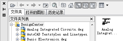 - 历史记录。显示设计中心中以前打开的文件的列表。双击列表中的某个图形文件,可以在“文件夹”选项卡中的树状视图中定位此图形文件并将其内容加载到内容区中。