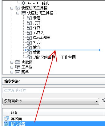 - 在“命令列表”窗格下,将要添加的命令或控件拖动到“<文件名> 中的自定义设置”窗格中的“快速访问工具栏”。