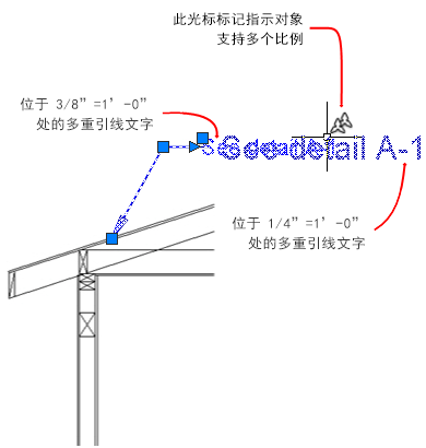 下图显示了一条多重引线,并为它指定了两种不同的对象比例。