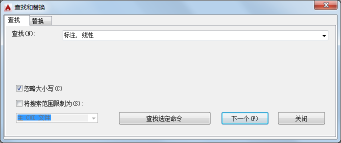 “查找和替换”命令或命令特性(命令名称、说明或宏)。使用“查找”选项卡查找指定的文本字符串,使用“替换”选项卡查找并替换指定的文本字符串。