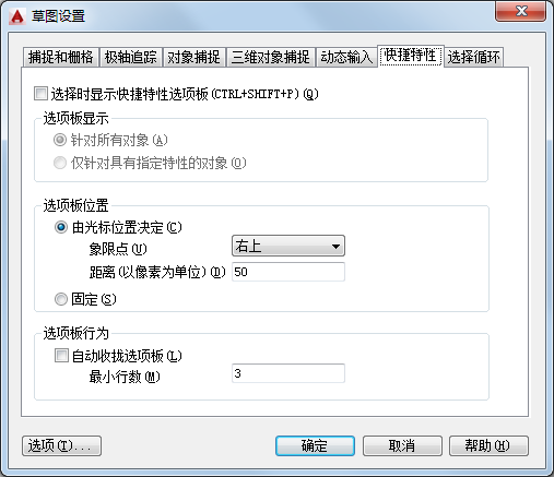 在固定位置显示“快捷特性”选项板。可以通过拖动选项板指定一个新位置。(QPLOCATION 系统变量)