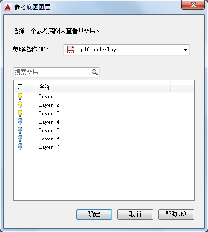 使用 DWFLAYERS、PDFLAYERS、DGNLAYERS 或 ULAYERS 命令,或在选定的参考底图上单击鼠标右键,然后单击快捷菜单中的“图层”。