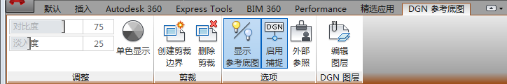选择图形中的 DGN 参考底图时,“DGN 参考底图”上下文选项卡将显示在功能区上。