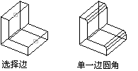 如果选择汇聚于顶点构成长方体角点的三条或三条以上的边,则当三条边相互之间的三个圆角半径都相同时,执行 FILLET 将计算出属于球体一部分的顶点过渡。