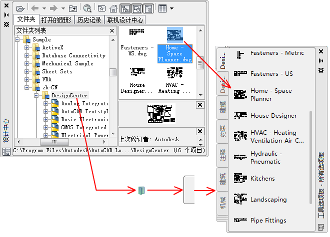 - 从设计中心拖动图形、块和图案填充。将已添加到工具选项板中的图形拖动到另一个图形中时,图形将作为块插入。