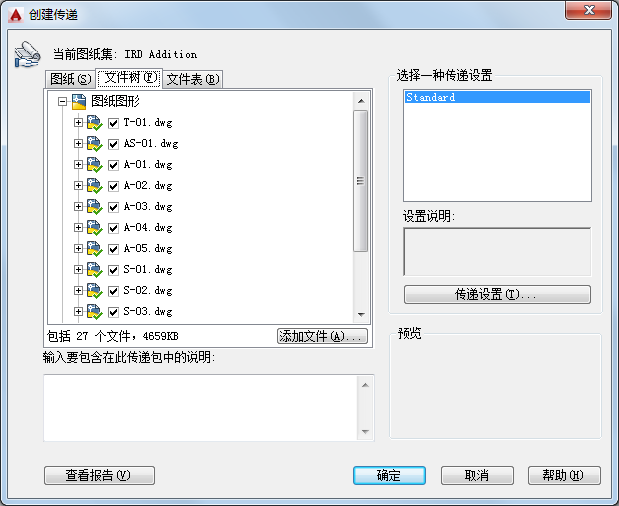 默认情况下,将列出与当前图形相关的所有文件(例如相关的外部参照、打印样式和字体)。用户可以向传递包中添加文件或从中删除现有文件。传递包不包含由 URL 引用的相关文件。
