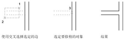 修剪若干个对象时,使用不同的选择方法有助于选择当前的剪切边和修剪对象。在下例中,剪切边是利用窗交选择选定的。