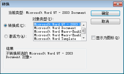 在某个嵌入对象上单击鼠标右键,然后依次单击“OLE”“转换”。