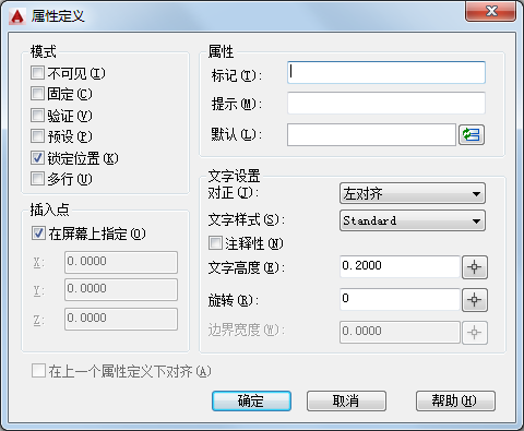 指定属性位置。输入坐标值,或选择“在屏幕上指定”,并使用定点设备来指定属性相对于其他对象的位置。