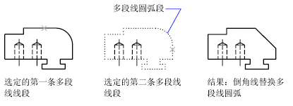 可以为相邻或只能用一条圆弧段分开的多段线的线段创建倒角。如图所示,如果它们被圆弧段间隔,倒角将删除此圆弧并用倒角线替换它。