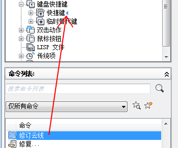- 要创建快捷键,请在“命令列表”窗格中,将命令拖至“<文件名> 中的自定义设置”窗格的“快捷键”节点。