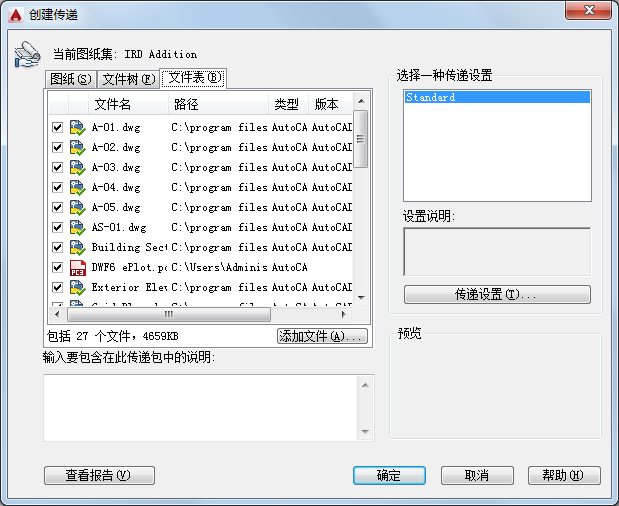 默认情况下,将列出与当前图形相关的所有文件(例如相关的外部参照、打印样式和字体)。用户可以向传递包中添加文件或从中删除现有文件。传递包不包含由 URL 引用的相关文件。