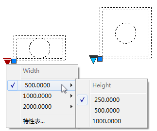 启用了反向查寻的查寻特性向动态块参照中添加查寻夹点。单击此夹点时,会显示该列的查寻值下拉列表。选定的列表项的相应输入特性值将分配给块参照。